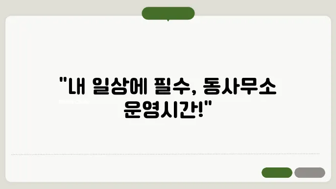 전반적으로 동사무소 운영 시간에 대한 올바른 정보는 주민들이 원활한 행정 서비스를 이용하기 위해 필수적입니다. 시간이 불확실하거나 변동성이 있는 때에는 꼭 사전 확인이 필요합니다. 모든 동사무소는 지역 주민들이 이용할 수 있도록 다양한 서비스를 제공하고 있으며, 그에 따라 운영 시간이 잘 관리되어야만 해요. 이러한 정보는 주민들에게 매우 소중한 것이며, 이를 잘 파악하고 이용하는 것이 여러분의 생활을 더 편리하고 유연하게 만들 것입니다.