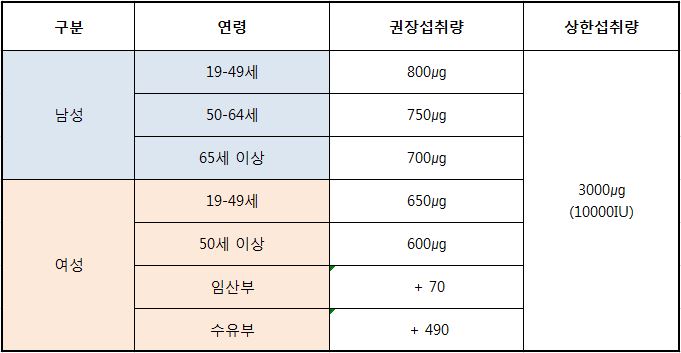 비타민 A의 권장 섭취량은 성별과 연령에 따라 조금씩 다릅니다. 일반적으로 성인 남성은 하루에 약 900 마이크로그램, 성인 여성은 약 700 마이크로그램의 비타민 A를 섭취하는 것이 권장됩니다. 이는 식품을 통해 자연스럽게 섭취하는 양을 의미합니다.