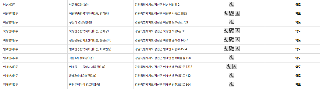 - 남면제1투: 남면종합복지회관 (1층, 연회장), 강원특별자치도 정선군 남면 칠현로 80